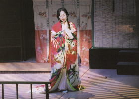 若紫の可憐さをピンクの桜でイメージし、やがて赤紫に色づいてそして最後に紫の藤に変身して行き、紫の上が大人の女性に成長するごとに藤壺そっくりになって行く様を表現しています。